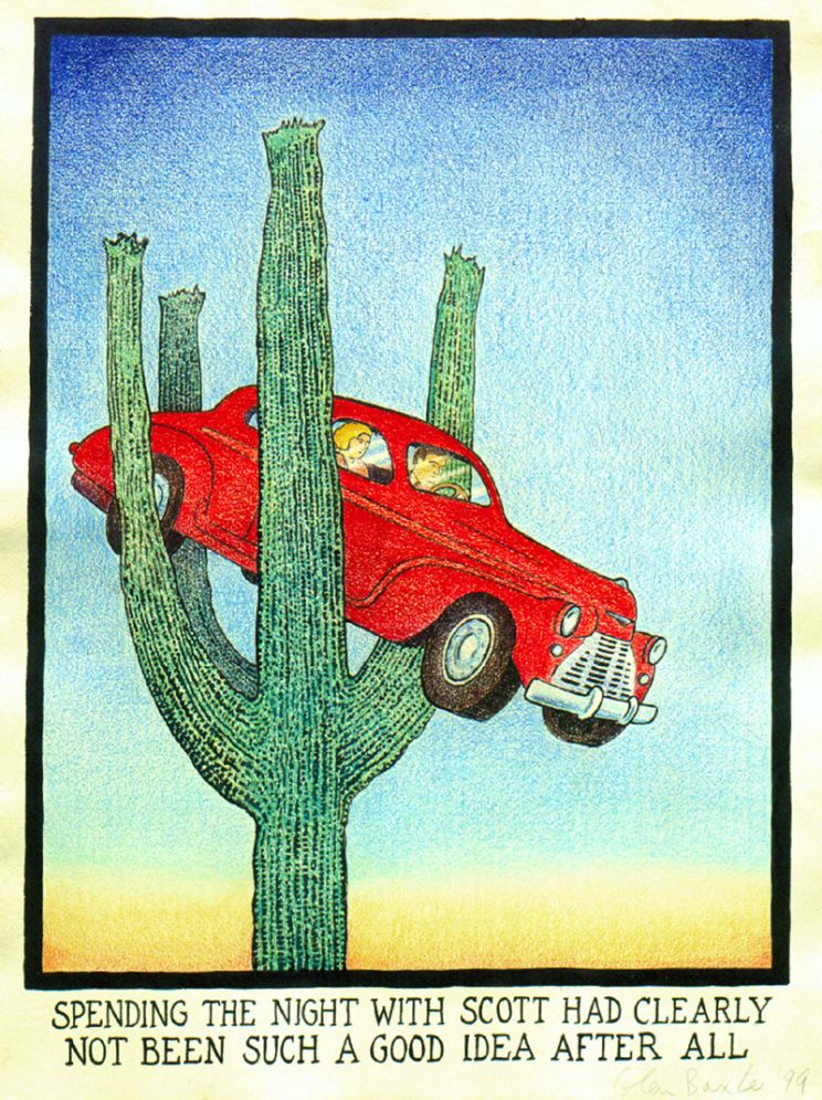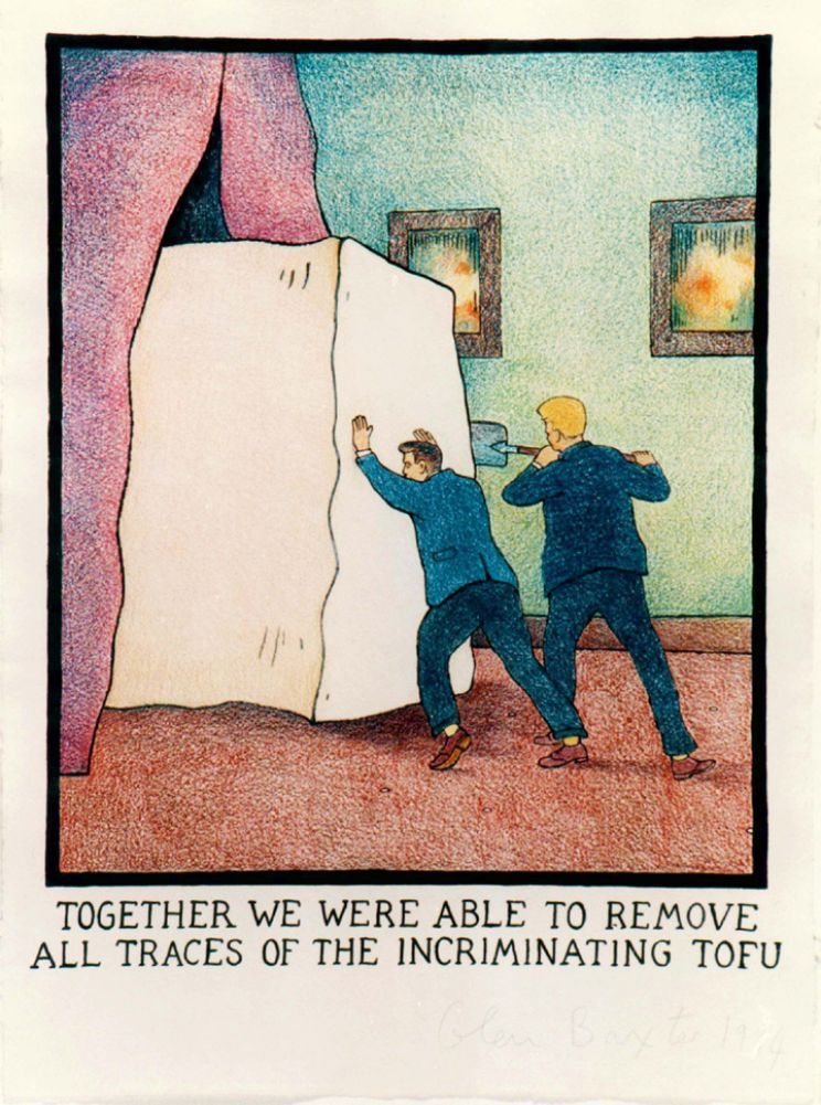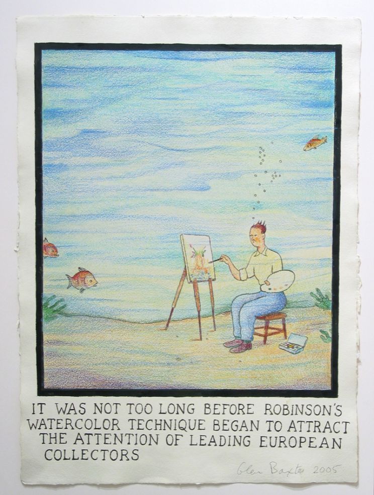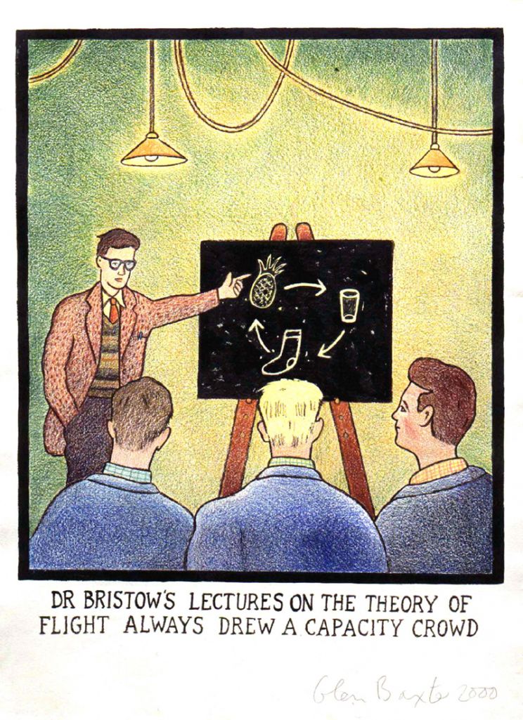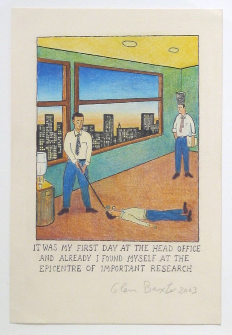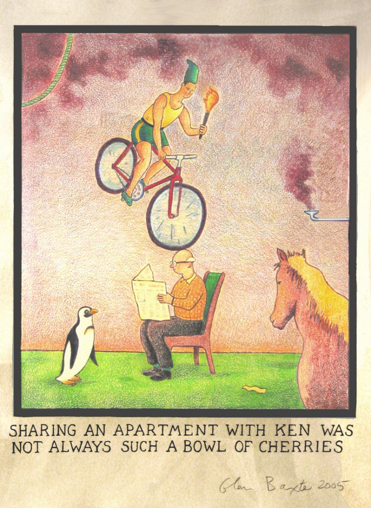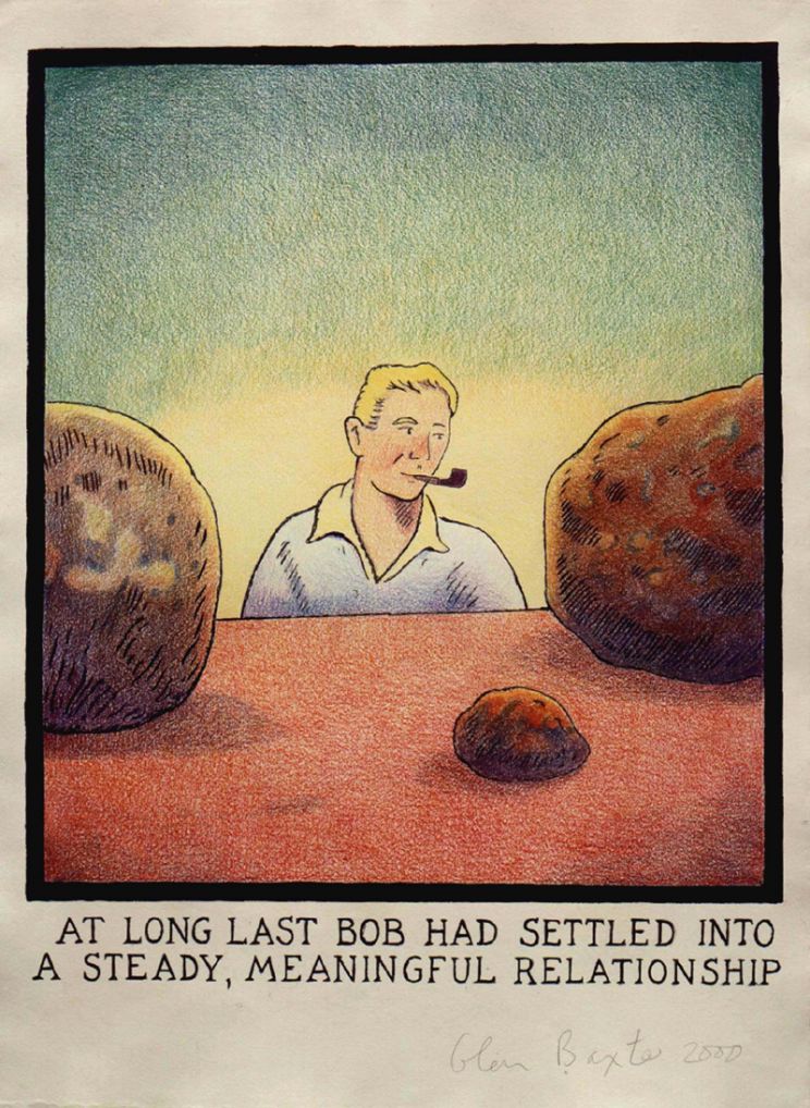 Major exhibitions of Glen Baxter’s drawings and paintings have been held in New York, Paris, San Francisco, London, Munich, Tokyo and Sydney. In 1999 Baxter was commissioned by the French government to execute a tapestry. He has also worked on a series of etchings for the National Museum of Printmaking in Chatou, Paris. His work is in the collections of the Tate Gallery and V&A Museum in London and numerous museums and private collections around the world.