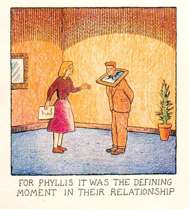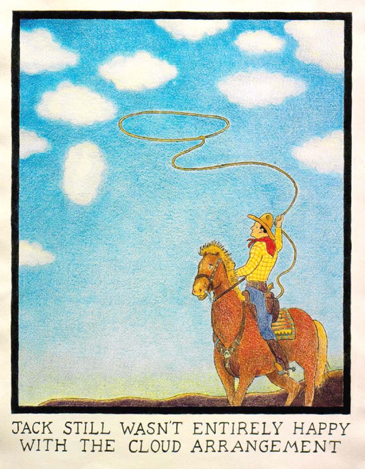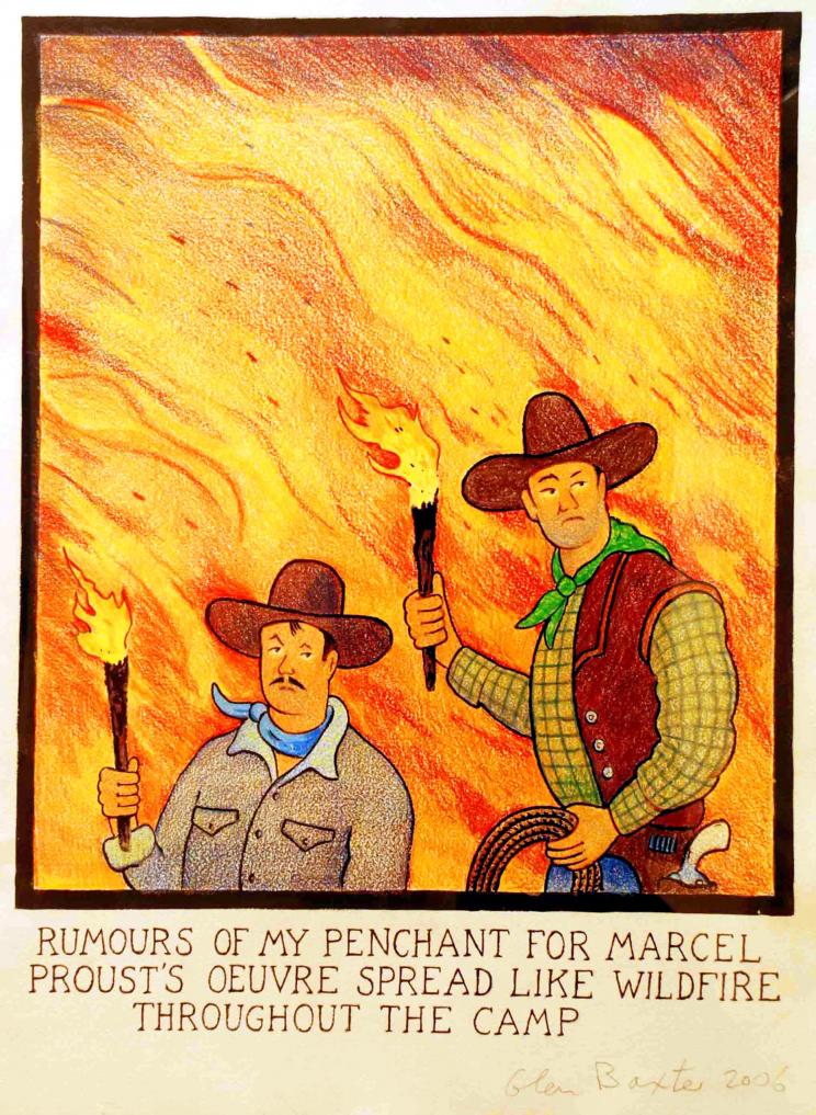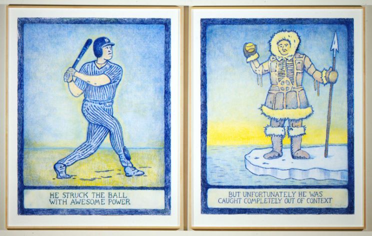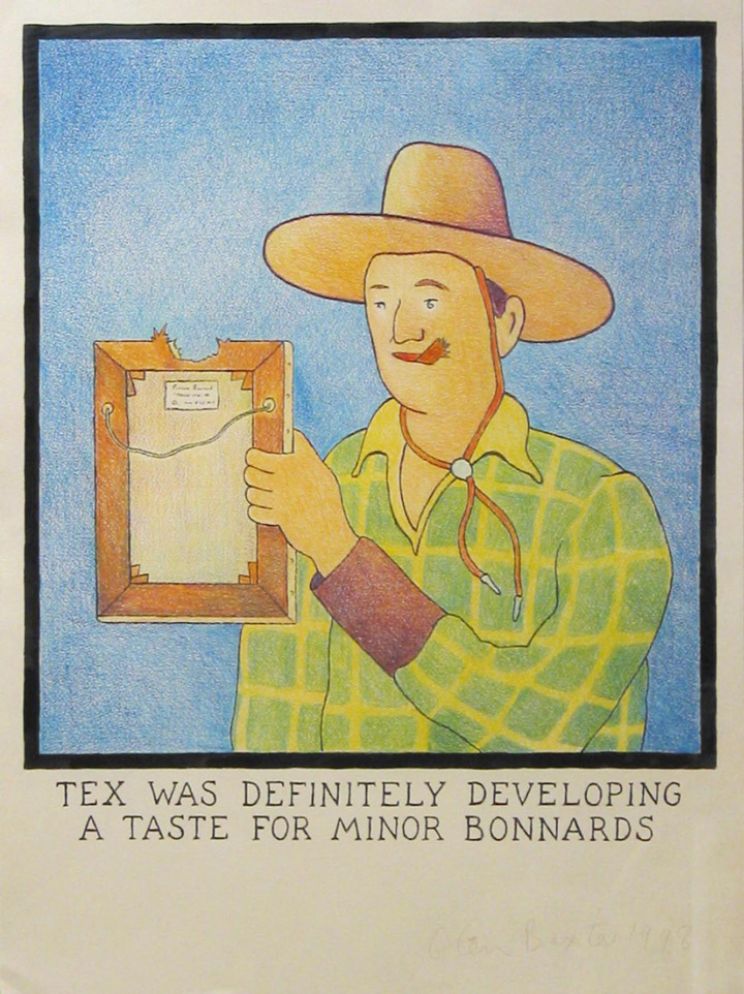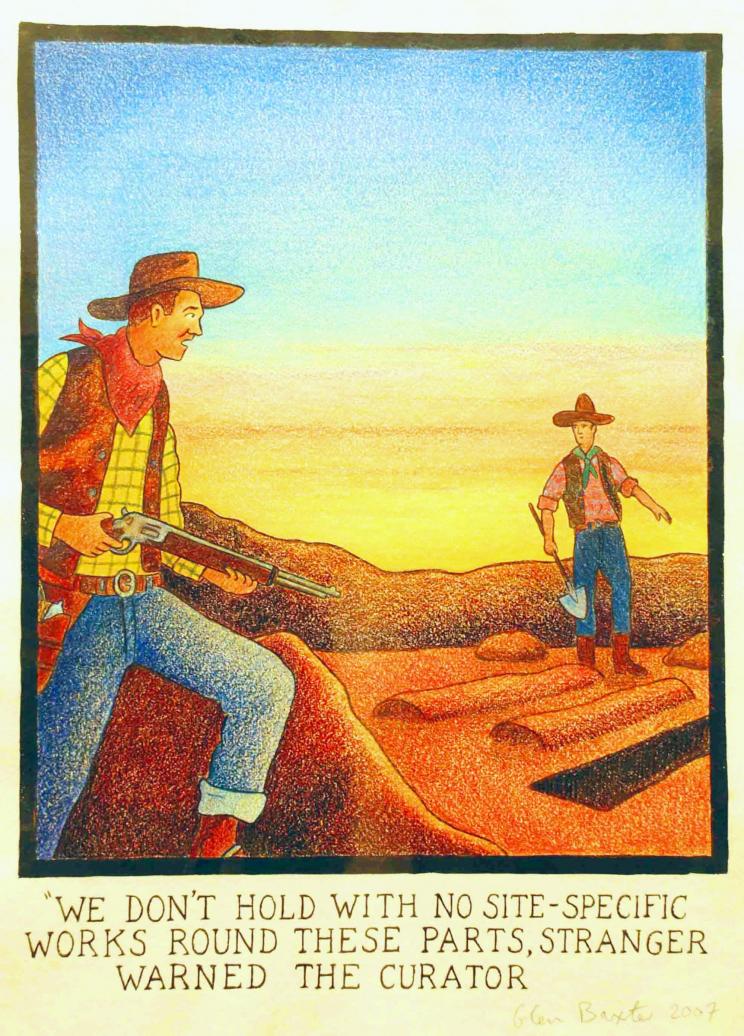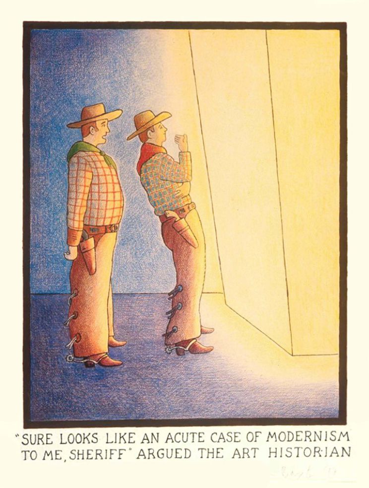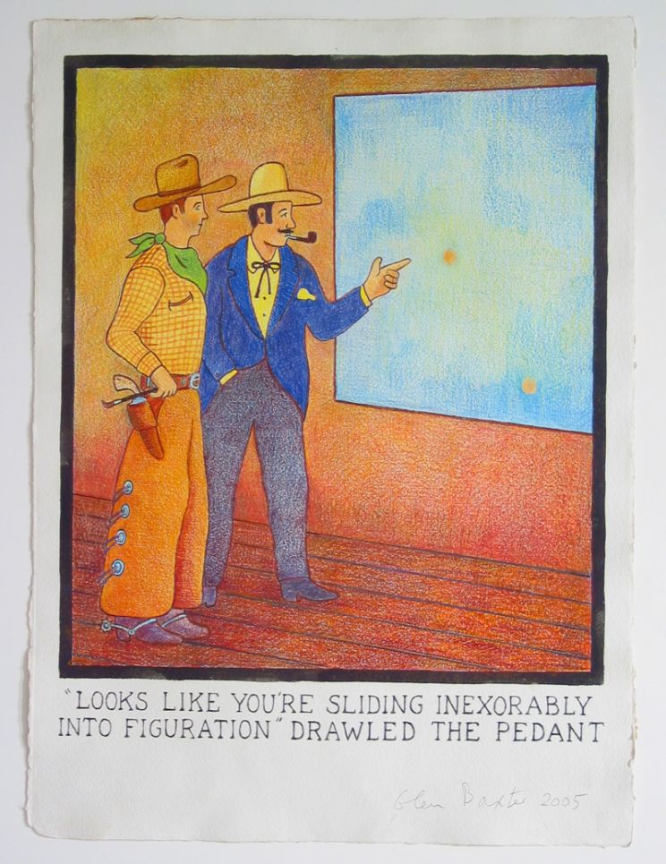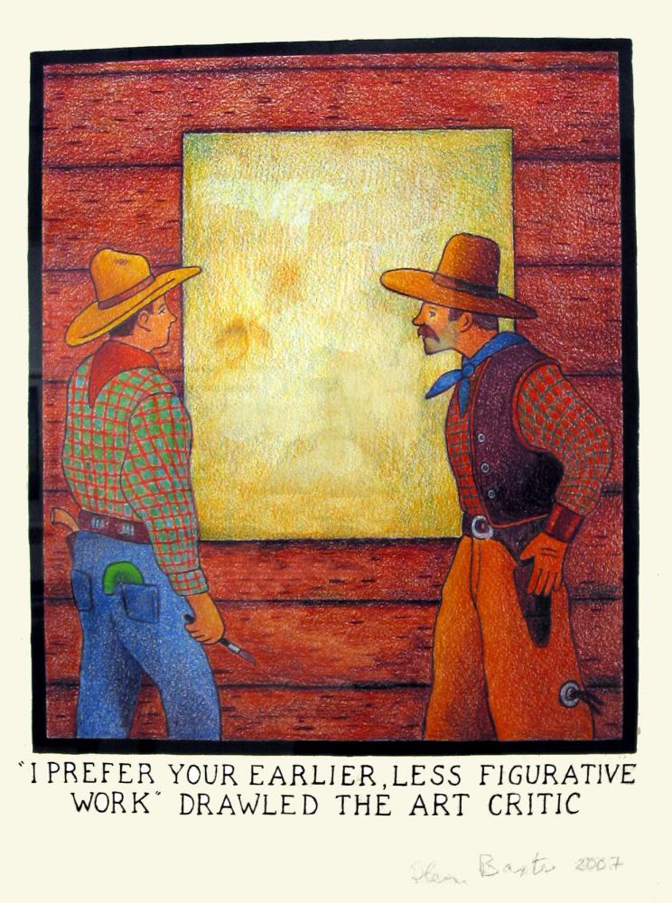 Baxter’s drawings most overtly enlist juxtaposition in an ongoing series set in the Wild West, where cowboys come face-to-face with the sort of abstract art his Leeds classmates so admired. For instance, Baxter depicts two men in Stetsons debating the merits of a painting comprising a single small blotch of color on an enormous blank canvas. “To my mind it seems too overtly freighted with meaning, Jed,” says one cowboy to the other. Aping artworld pretense, they make artistic discourse sound ridiculous while also implicitly questioning the conviction with which cognoscenti express their opinions.