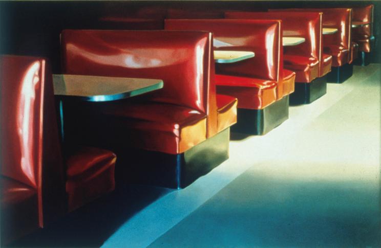 The paintings of John Register [1939-1996] chronicle a search for overlooked beauty in unpeopled places. As a record of America’s depersonalized landscapes, his paintings of empty coffee shops in Los Angeles, old hotels in Chicago and bus stations in the Southwestern desert celebrate sunlight, but also a haunting stillness tinged with regret and hope.
