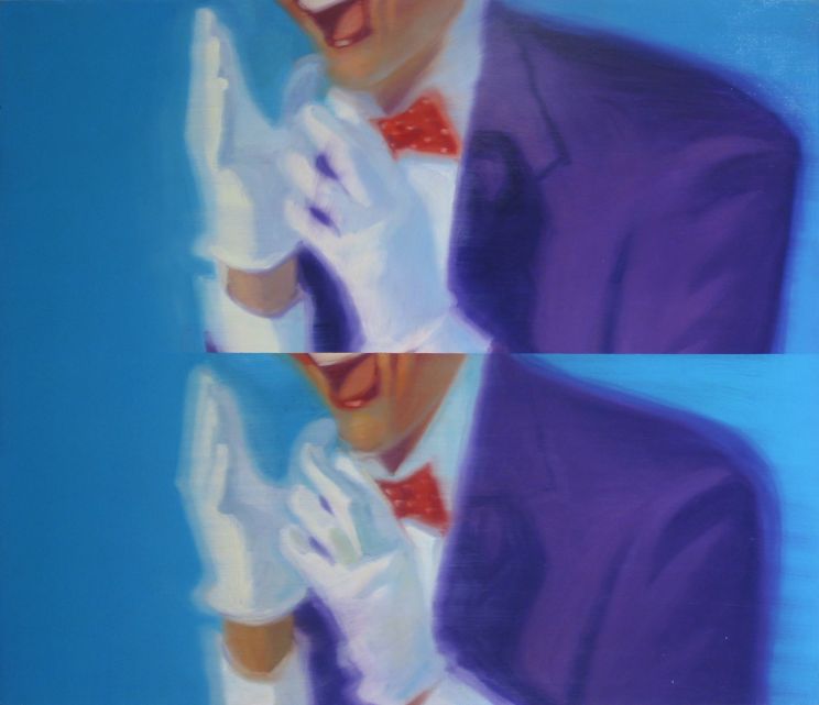 Greenberg toys like a Pop artist with conventions of 20th-century representation and abstraction. Among the artists that readily come to mind are Andy Warhol, Roy Lichtenstein, David Hockney, and Ed Ruscha. Even the Op-artist Bridget Riley’s systematic abstraction can be seen nudging itself into various compositions. Greenberg may be thinking about the evolution of these once revolutionary Modernist’s styles into kitsch–and in that respect he is updating all of these great artists; but like them, he also revels in painting as an end to itself.