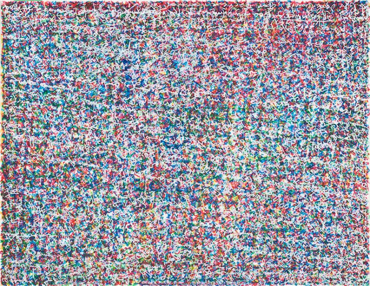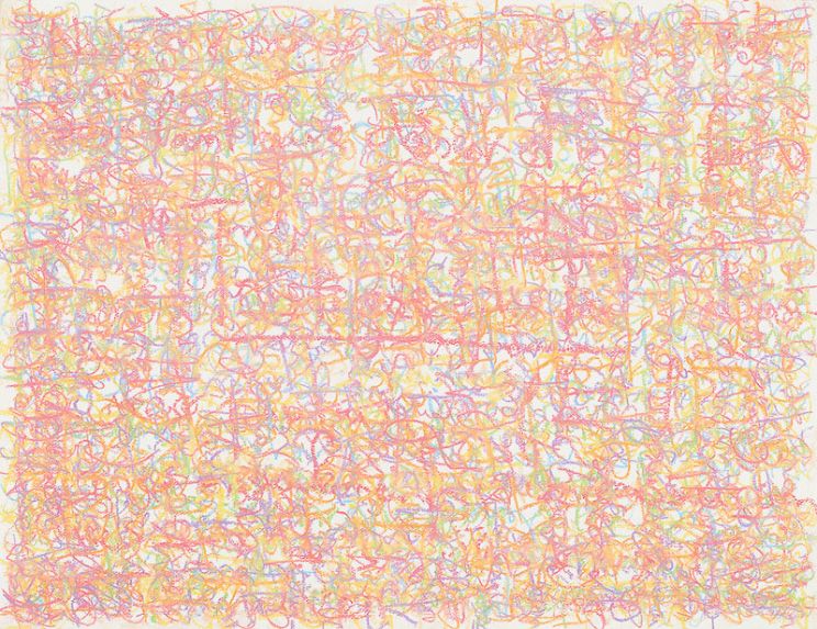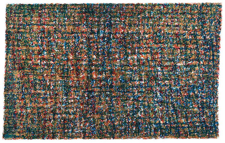 His series Jouissance du temps (Enjoyment of Time), goes one step further in displaying the paradoxical dialogue between word/image and literature/art through the disappearance of the meaning of text into its own graphic representation. Although the words cannot be understood any longer, they are all there, a whole short story taking place on each painting and drawing, expressing the pure materiality of the text.