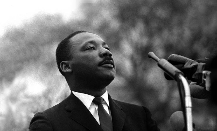 Dr. Martin Luther King, Jr. speaking to crowd of 25,000 at end of march