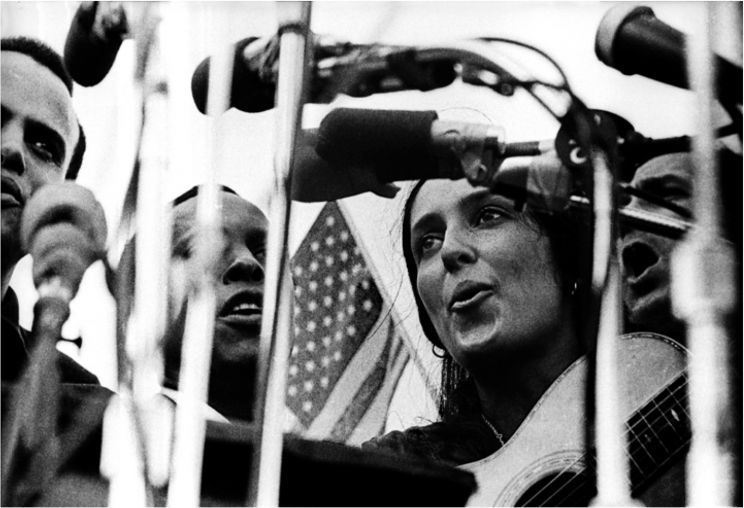 Joan Baez behind platform after Dr. Martin Luther King, Jr. speech