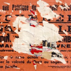 In 1949, Villeglé and his then artistic collaborator and life-long friend, Raymond Hains [1926-2005], began scavenging advertising from billboards on the grand boulevards, snatching political posters in the financial district, and pillaging Left Bank walls plastered with flyers for jazz concerts and art exhibitions. Mounting them on canvas, they presented them as a new kind of art. Between 1949 and 2003, Villeglé himself plucked more than 4,500 works from all twenty of Paris’s arrondissements, carefully labeling each with the exact date and street address of the poster’s origin. Each work became a unique time capsule of the ever-changing city.