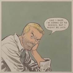 “While the need to connect and build relationships was as important as ever, the political culture was pushing us ever further into self-involved isolation,” explains Kearns. This isolation is manifested in Kearns’s lonely compositions which depict only a single subject each. In comparison to Kearns’s prior work, delightfully cacophonous and often teeming with multiple characters in vivid color, these new, mostly pastel, paintings and drawings, like the modern life, feel empty and void of connection. Ironically however, many of Kearns’s subjects seem to be mid-conversation with another person, via Roy Lichtenstein-esque speech bubbles, but with the other conversation participant not depicted, their actual existence becomes a question more than a reality.