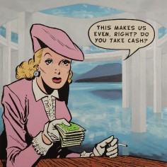 “I want my art to tell stories about the reality I experience, hopefully, to share in shaping social meaning,” says Kearns. “During the time I was making the works in this show I was aware of a much more transactional mindset pervading public thought.” This transactionality is depicted rather literally in paintings like, The Dealmaker, where a finely dressed 1940s woman extends a stack of money, asking “This makes us even, right? Do you take cash?”