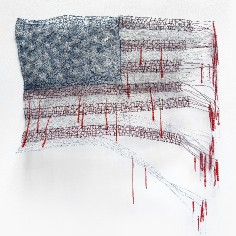 Just as Robert Rauschenberg employed the American flag to interrogate national identity and politics in works such as Signs (1970), Mays created This Is America, an American flag constructed of wire, with beads hanging from its frayed edges representing blood and tears.