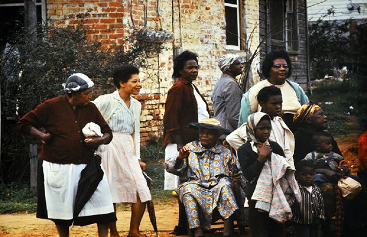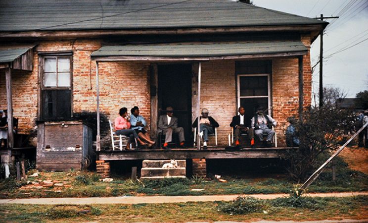 Black families on porch watching Selma civil rights marchers