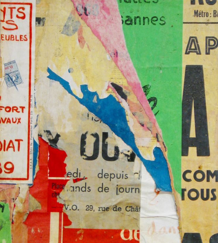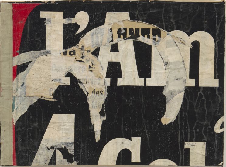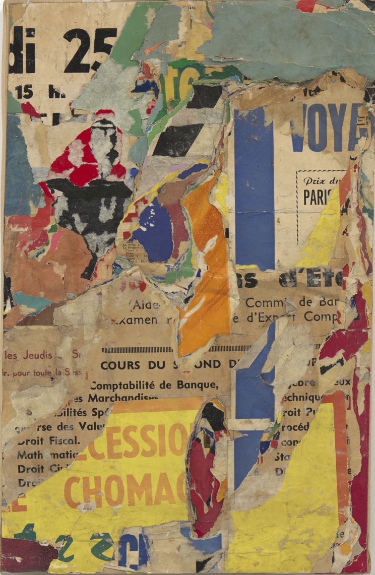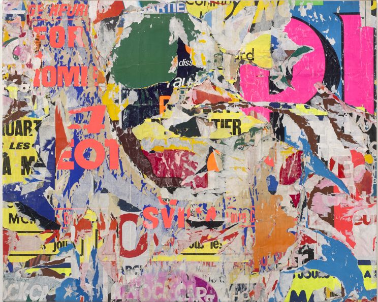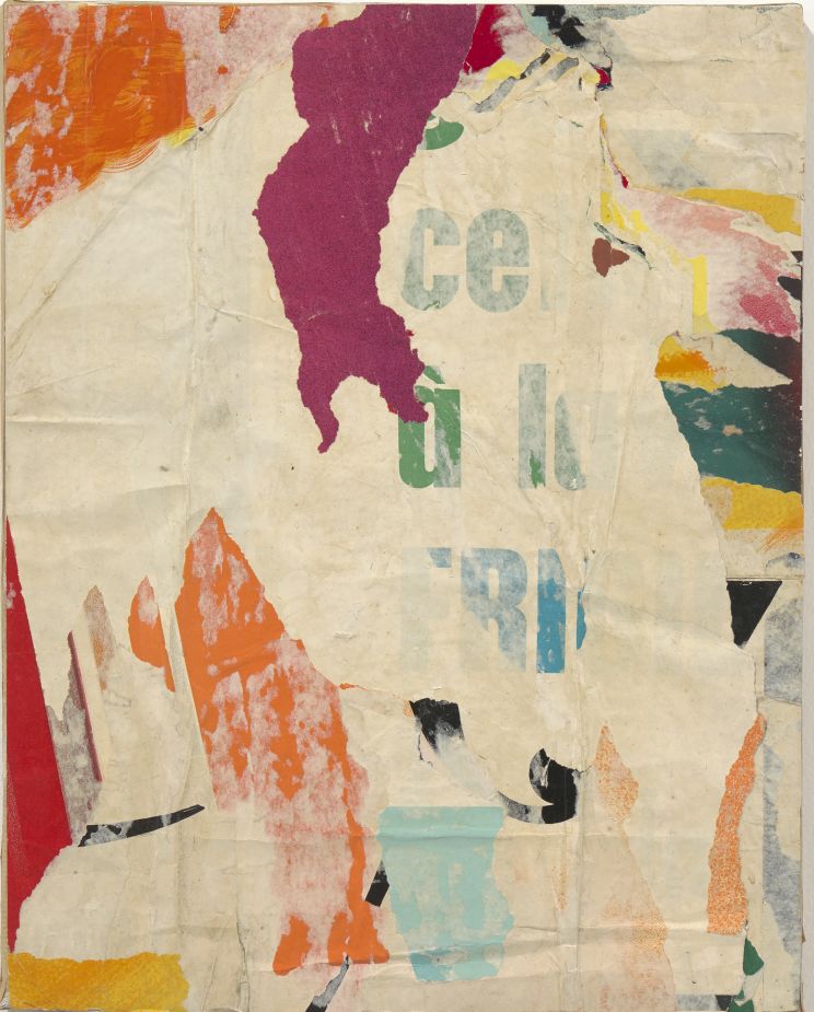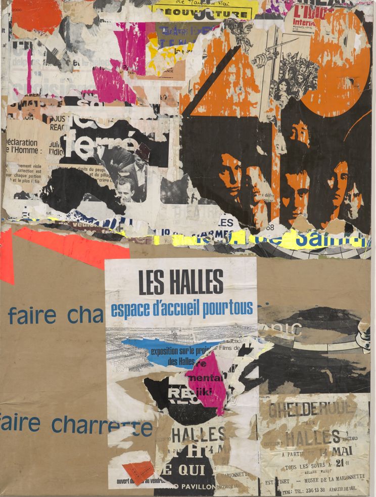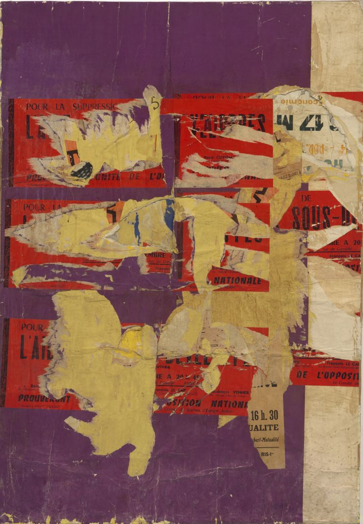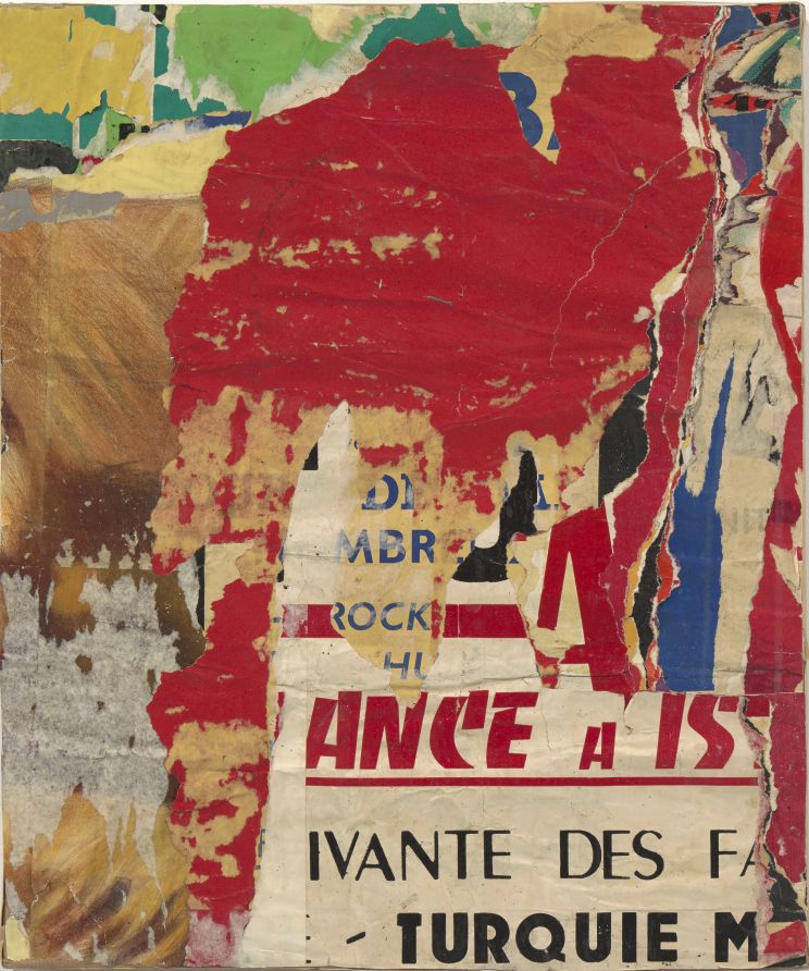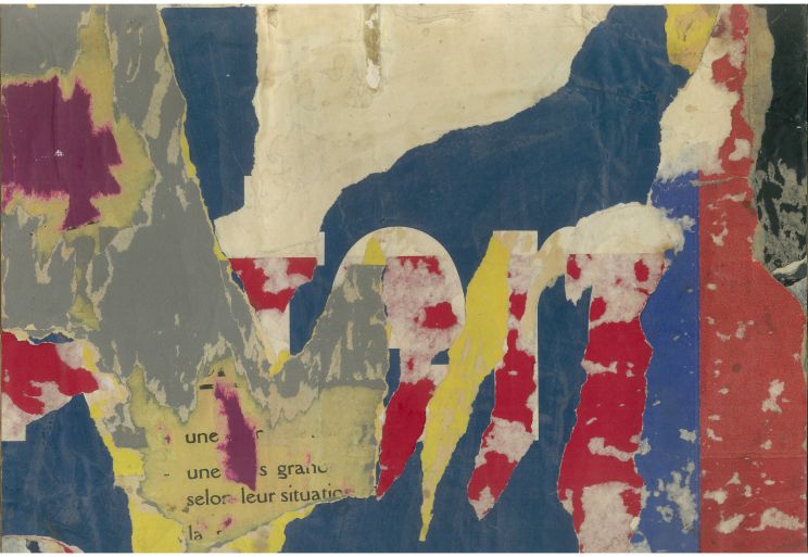 Since 1949, Villeglé, a founding member of the Nouveau Réaliste group (with Yves Klein, Pierre Restany, Arman, Raymond Hains, Mimmo Rotella, etc.), began systematically collecting scraps of posters torn from walls around Paris, inventing a brand new artistic practice, which in turn gave rise to a new type of work of art. This radical re-appropriation of an otherwise ordinary material enabled him to capture the spirit of the times and the image of a society driven by communication, which expressed itself above all through its obsession with current affairs and the omnipresence of the media.