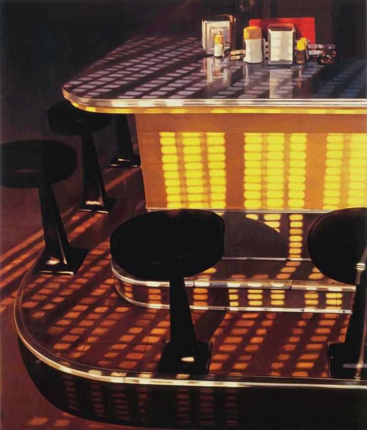 The paintings of John Register [1939-1996] chronicle a search for overlooked beauty in unpeopled places. As a record of America’s depersonalized landscapes, his paintings of empty coffee shops in Los Angeles, old hotels in Chicago and bus stations in the Southwestern desert celebrate sunlight, but also a haunting stillness tinged with regret and hope.