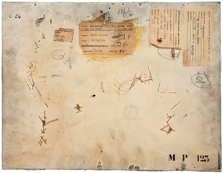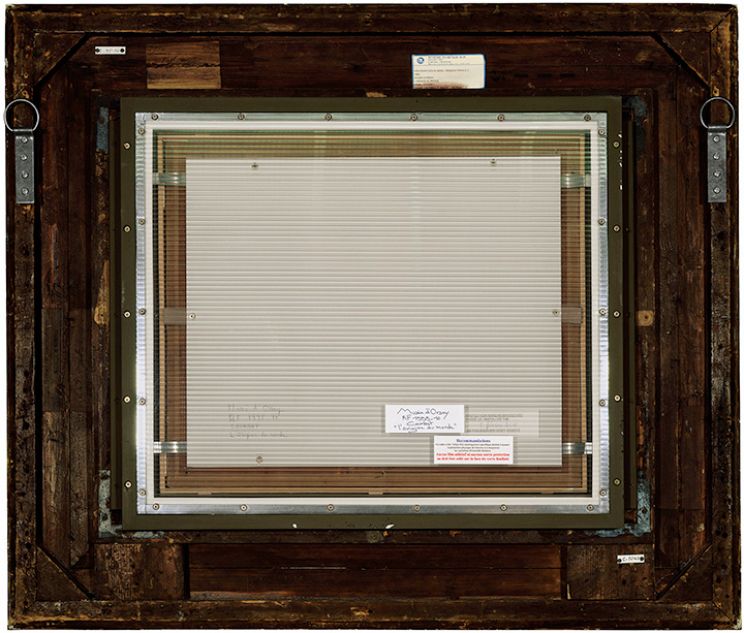 Versos, begun in 2005, therefore constitutes a logical sequel to the series that preceded it. Working for the first time in color, Gronon has photographed the backside of paintings by modern masters, presenting each work at actual size. At the same time, however, they effect a kind of reversal of perspective. By choosing paintings (based purely on the aesthetic of the verso side), Gronon has taken an object whose value lies, precisely, in its façade, and yet, here what he shows is not the front, as with his other objects, but the back. Because these are paintings, color is de rigeur, as is the way he surrounds the image with white, as in traditional photography. Suddenly, instead of showing us the obverse, he takes us behind the scenes, approaching the masterpiece via the scullery, the wings, the nuts, the bolts. This becomes more risky when the identity of the recto becomes known and is accompanied by more and more noteworthy information (signatures, markings, museum labels, etc.). The documentary interest also grows and threatens to overwhelm. The greater this interest, the longer it takes us to really look at the photographic work. This predominance of the anecdotal is necessarily heightened by the fame and popularity of the referent.