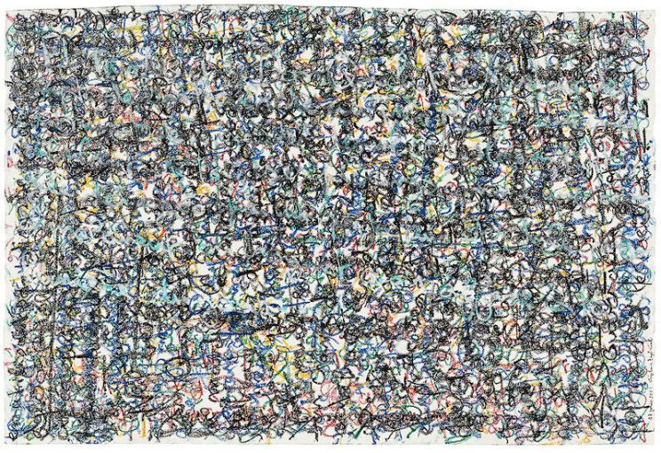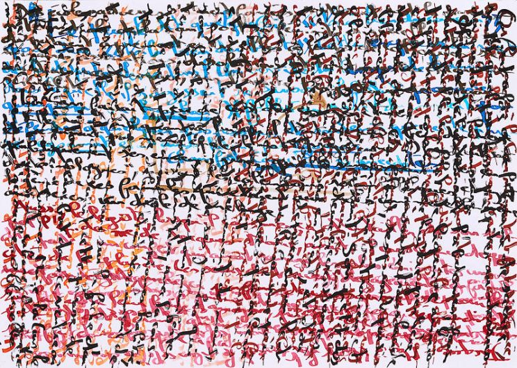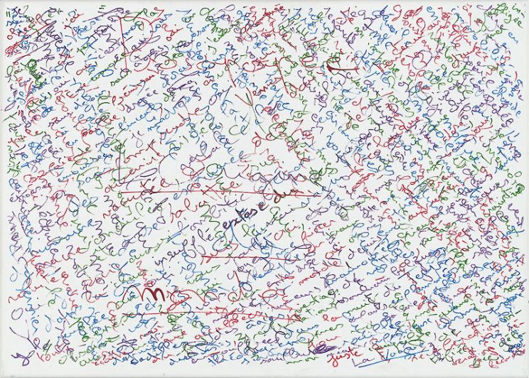 His series Jouissance du temps (Enjoyment of Time), goes one step further in displaying the paradoxical dialogue between word/image and literature/art through the disappearance of the meaning of text into its own graphic representation. Although the words cannot be understood any longer, they are all there, a whole short story taking place on each painting and drawing, expressing the pure materiality of the text.