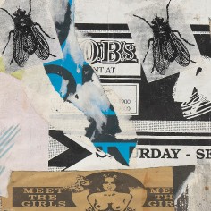 In 1949, Villeglé and his then artistic collaborator and life-long friend, Raymond Hains [1926-2005], began scavenging advertising from billboards on the grand boulevards, snatching political posters in the financial district, and pillaging Left Bank walls plastered with flyers for jazz concerts and art exhibitions. Mounting them on canvas, they presented them as a new kind of art. Between 1949 and 2003, Villeglé himself plucked more than 4,500 works from all twenty of Paris’s arrondissements, carefully labeling each with the exact date and street address of the poster’s origin. Each work became a unique time capsule of the ever-changing city.