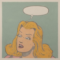 “While the need to connect and build relationships was as important as ever, the political culture was pushing us ever further into self-involved isolation,” explains Kearns. This isolation is manifested in Kearns’s lonely compositions which depict only a single subject each. In comparison to Kearns’s prior work, delightfully cacophonous and often teeming with multiple characters in vivid color, these new, mostly pastel, paintings and drawings, like the modern life, feel empty and void of connection. Ironically however, many of Kearns’s subjects seem to be mid-conversation with another person, via Roy Lichtenstein-esque speech bubbles, but with the other conversation participant not depicted, their actual existence becomes a question more than a reality.