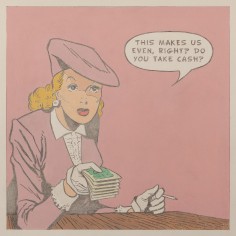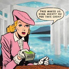 “I want my art to tell stories about the reality I experience, hopefully, to share in shaping social meaning,” says Kearns. “During the time I was making the works in this show I was aware of a much more transactional mindset pervading public thought.” This transactionality is depicted rather literally in paintings like, The Dealmaker, where a finely dressed 1940s woman extends a stack of money, asking “This makes us even, right? Do you take cash?”