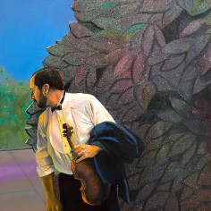 Stock saw a connection between trompe l'oeil illusionism and magic, which he performed with elan and which provided another important inspiration. The connection is explicit in Reverie #11 (2008), which shows the legs of a performer levitating over a trompe l’oeil stage set. It’s also evident in several paintings depicting performers from Teatro Zinzanni, a San Francisco dinner theater that became a second home for the artist.