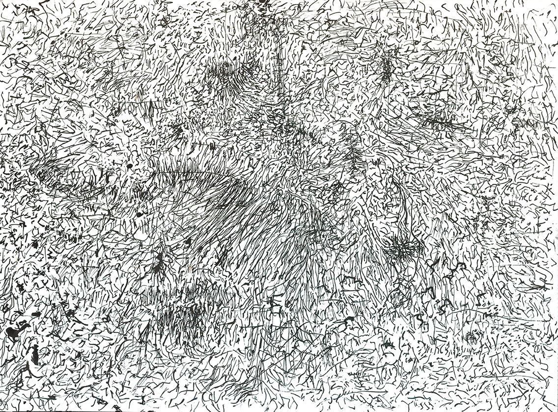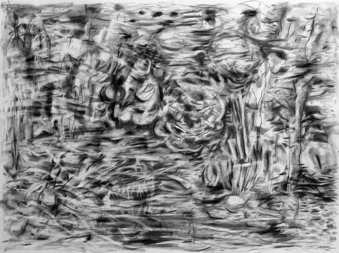 Kremer’s process began by projecting each of the paintings onto a sheet of paper, rapidly tracing the forms with loose graphite, the work of a couple hours. These light gray marks, as faint as shadow, then served as the undergirding for a new work created in pencil and charcoal without additional reference to the original. By shifting from painting to drawing, and dropping out color, Kremer excavated structure, which she used to inform the development of new figures. The results often have formal overlaps with the original paintings, as can be seen in Untitled I, based on Rudimentary Pixillation (1999), and reveal how her paintings, like Joan Mitchell’s, are drawn in a way, albeit with thick lines of paint.