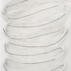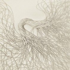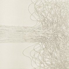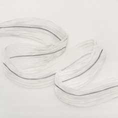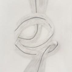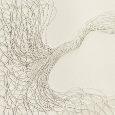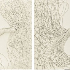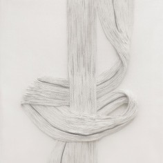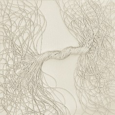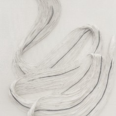 Central to the exhibition are the fiber-based canvases. Composed of bundled strands affixed to the surface, suspended configurations bend, gather and taper under their own weight. These accumulations evoke bodily systems like veins, nerves or tendons, rendered externally and exposed. The dimensional mixed-media canvases extend a material language first established in Khalatbari’s earlier body of work 1401 N/m² Resistance, in which strands referenced the hair of Iranian women mandated to remain covered. Here, the strands mimic emotional fluctuation—rising, falling and looping in continuous lines that suggest the uneven rhythms of lived experience.