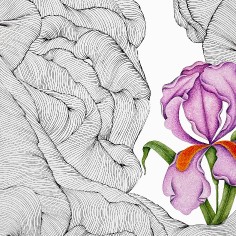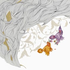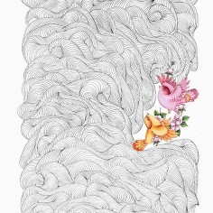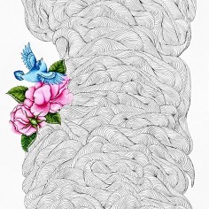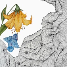 The works on paper operate on a different plane. Built from dense, repetitive ink lines, the drawings accumulate into intricate, wave-like fields that appear both meditative and overwhelming. Within these largely off-white expanses, small, vividly colored birds and blossoms emerge with heightened clarity. Drawing on Persian literary symbolism, these motifs signify longing, love, and endurance—moments of tenderness within shifting emotional terrain. Khalatbari’s restrained tonal palette reinforces her conception of sorrow as subtle and permeable—shared in presence, yet personal in meaning.