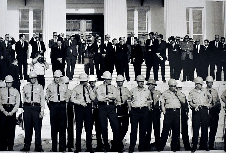 Alabama State Police arrayed across steps of state capital