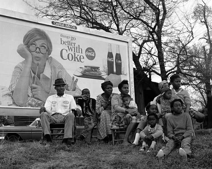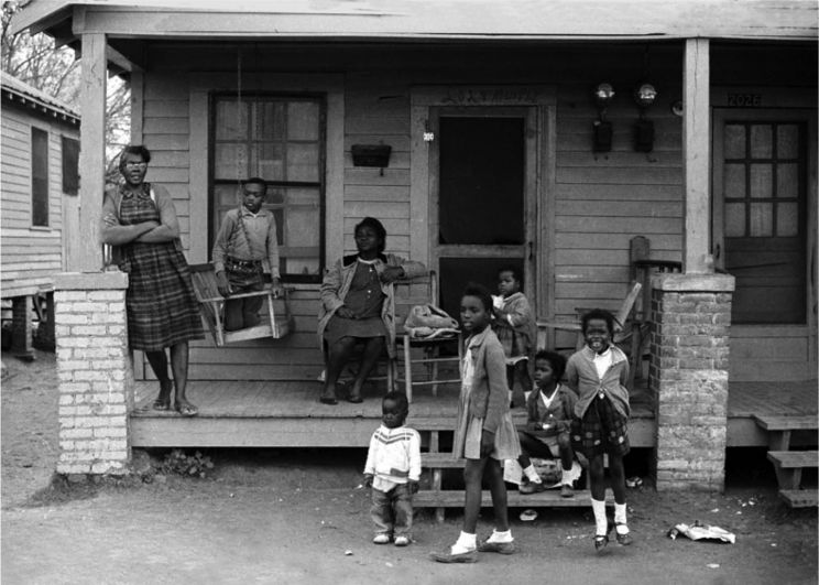 Black families on porch watching Selma civil rights marchers