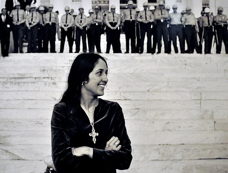 Joan Baez behind platform after Dr. Martin Luther King, Jr. speech